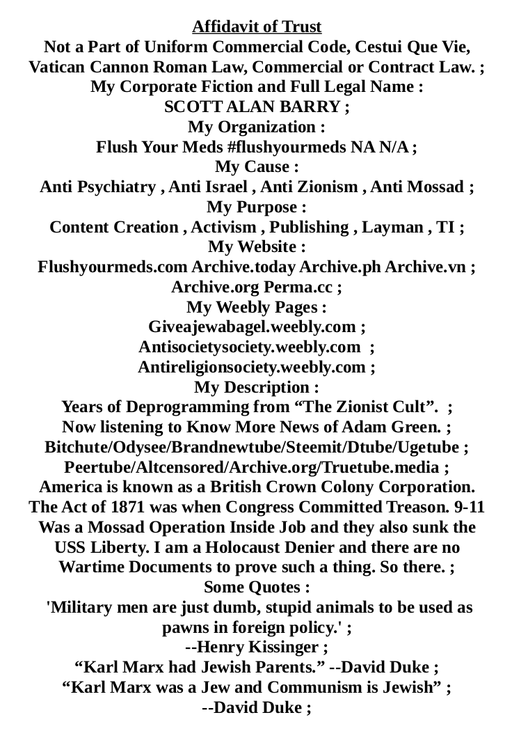 Share this postAffidavit of Trust #flushyourmedsflushyourmeds.substack.comCopy linkTwitterFacebookEmailAffidavit of Trust #flushyourmedsAffidavit of Trust #flushyourmeds ... ;Scott Barry48 min agoShare this postAffidavit of Trust #flushyourmedsflushyourmeds.substack.comCopy linkTwitterFacebookEmailAffidavit of Trust #flushyourmeds ... ;https://doi.org/10.1984/affidavit.432 … ;Publication Date: 2022 … ;Publication Name: Affidavit of Trust #flushyourmeds … ;Scott A. Barry / Scott A Barry / Scott Barry … ;Scott Alan Barry is an Atheist Holocaust Denier Dunce … ;